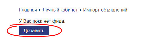 Если Вы только что подключились к возможности импорта - список Ваших фидов пуст. Необходимо добавить фид, как показано на иллюстрации ниже. Если же фид у Вас в аккаунте уже есть (например, Вы добавлили его ранее), то вместо кнопки "Добавить" Вы увидите кнопку "Изменить фид".