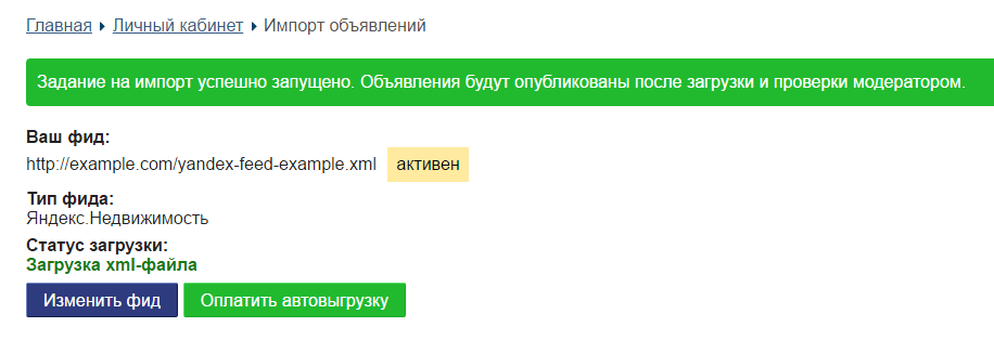 Повторный запуск импорта возможен не чаще чем раз в неделю. Если Вы не видите кнопки "Запустить импорт", значит прошло недостаточно времени с предыдущего запуска, либо фид еще не прошел модерацию. В случае успешного запуска Вы увидите следующий экран.